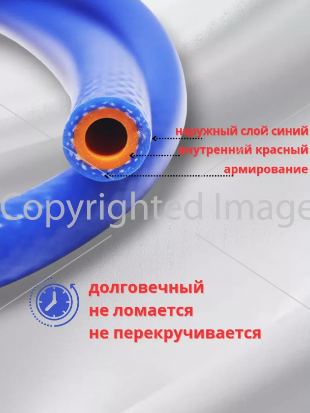 У шланга наружный слой синий, внутренний - красный. Силиконовый материал отличается долговечностью, со временем не трескается, не перекручивается, устойчив к воздействию ультрафиолетовых лучей, остается мягким. Армированные силиконовые шланги хорошо держат форму и отлично подходят для промышленных условий. В отличии от резиновых рукавов работоспособны в более широком диапазоне температуры, при этом рукава остаются мягкими, не стареют и не трескаются.